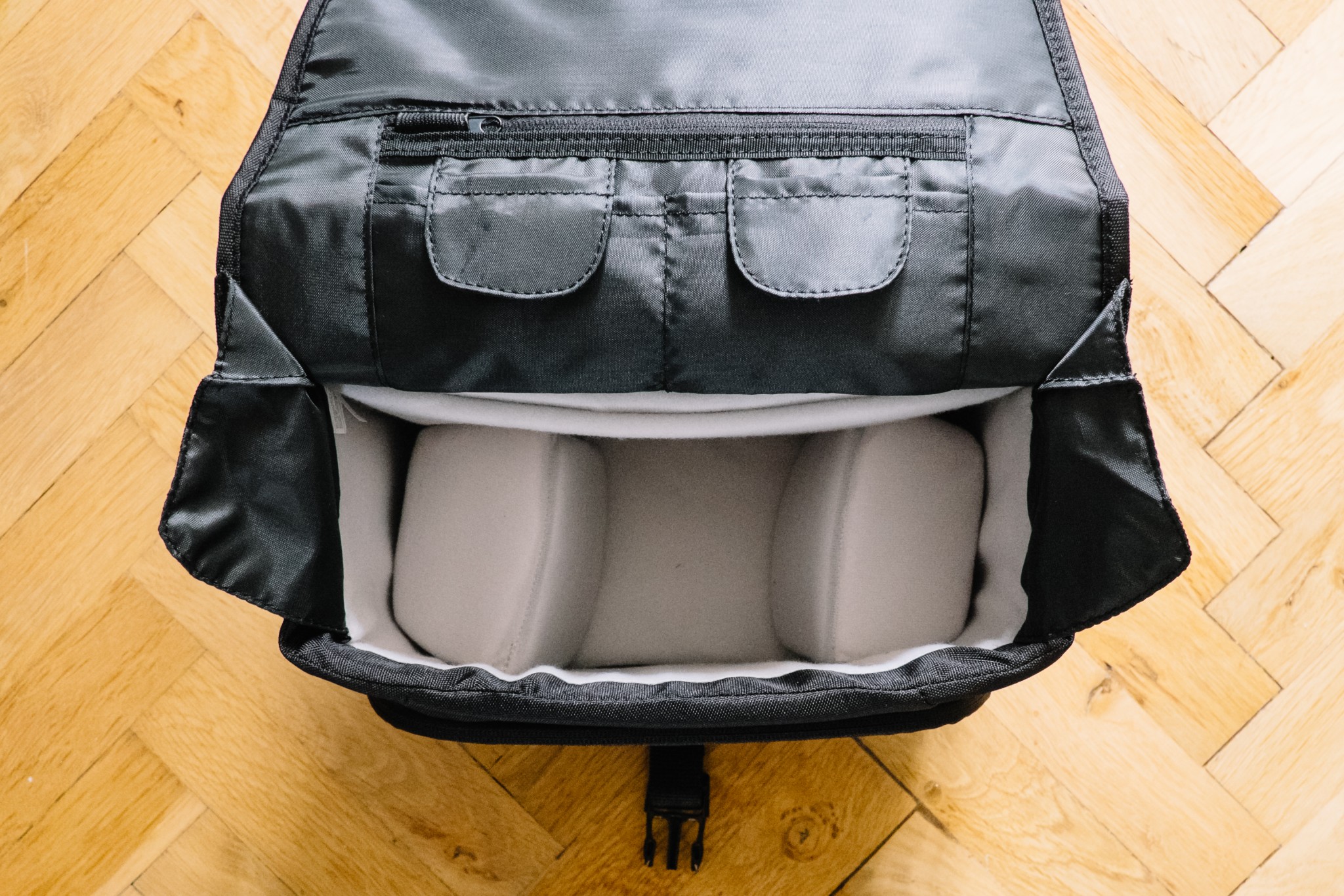 Innen lässt sich die Tasche durch zwei individuell einstellbare Fächer den eigenen Anforderungen aufteilen.